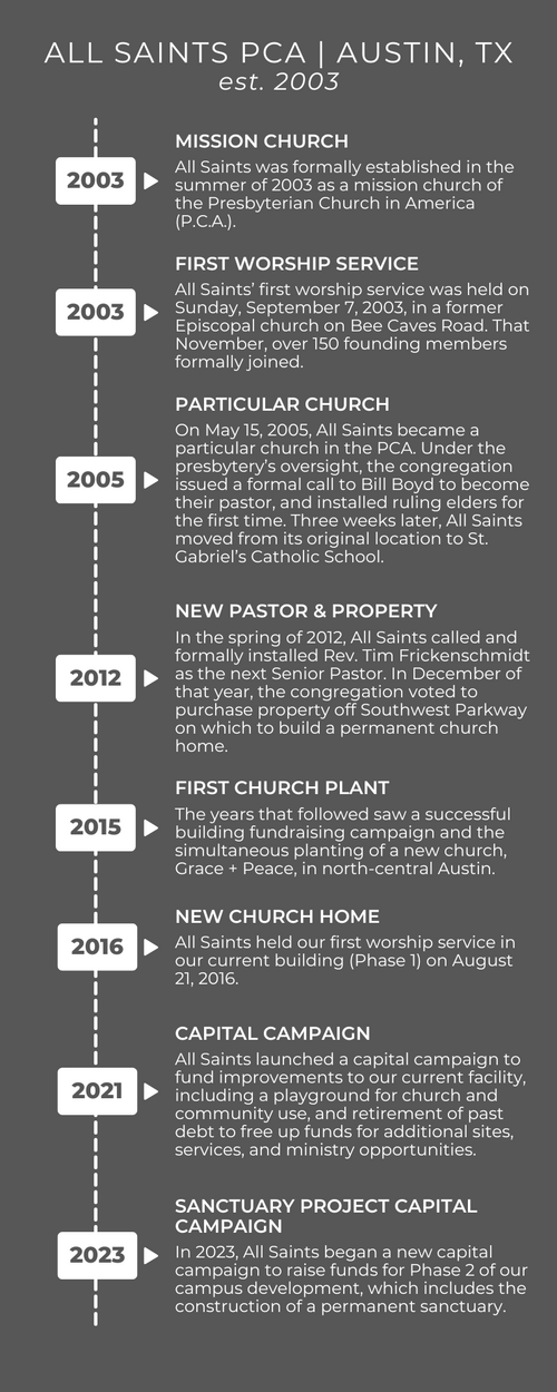 All Saints Presbyterian Church is a congregation of the Presbyterian Church in America (PCA). We believe that the Church exists to be the body of Christ to a broken world. Since our beginnings in 2003, we have sought to live out that calling here in the city of Austin. We hope to form our church, both corporately and each person individually, to follow Jesus as King by doing justice, loving mercy, and walking humbly with our God.