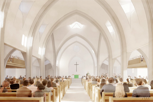 The current space in which we gather for worship is titled "Interim Sanctuary." This is because All Saints has always planned to complete our campus design with a permanent Sanctuary. The design for this Sanctuary comes from Andersson-Wise Architects who also designed the first phase of our campus.